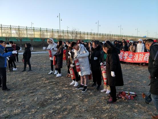 7:25分全体2018级学生和各年级学生代表在门球场空地集合,保卫处防火科科长徐长明对学生进行消防安全教育,讲解并现场演示灭火器的正确使用方法,随后,学生代表每人领取一个灭火器进行实际灭火操作,将点燃的干柴扑灭,演习结束。