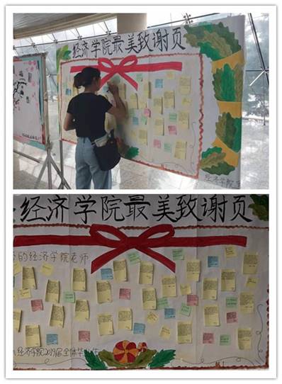 全体毕业生积极参与到本次活动中,纷纷来到展板前写下他们对辛勤教导他们四年老师们要说的话,国贸15-2班刘婧娴写到“真诚地向大学时光里的每一个点滴道一声感谢,谢谢在诸侯快讯ok1133.com这四年里我所遇到的一切,也正是因为这样,才成就了如今的我;金融15-3班张伍涛留言“四年的大学生活伴随着毕业论文的结束接近了尾声,还没有离开学校,便已经开始怀念大学四年的生活,同时也对接下来3年的研究生生涯充满着憧憬”。