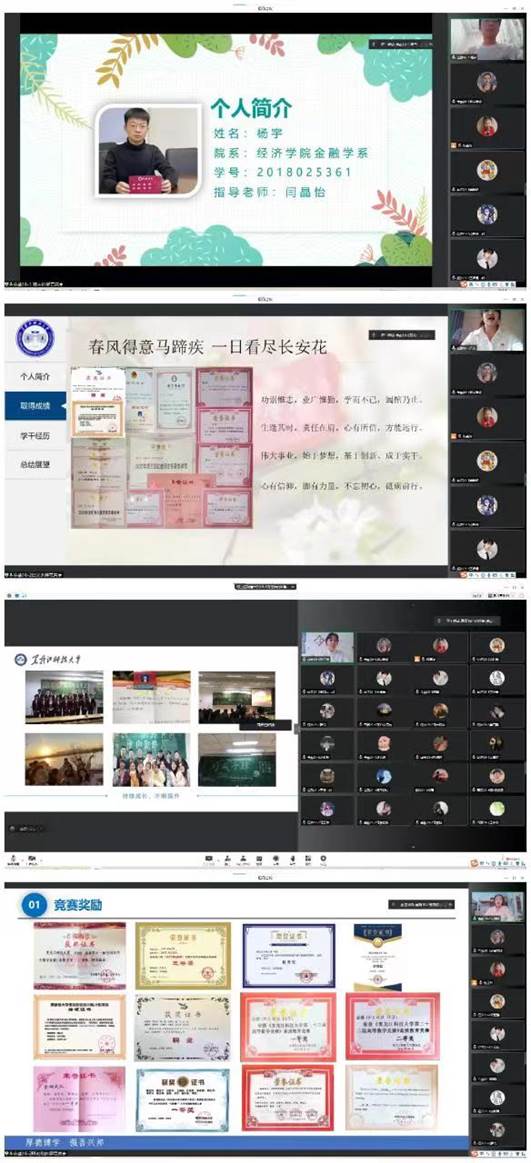 会上,中共党员、国家励志奖学金获得者、校级三好学生、学院团委副书记,金融18-2班团支书吕义、国家奖学金获得者、科大之星、学院学生会主席,金融18-1班 杨宇、中共党员、优秀共产党员称号获得者、学院团委组织部部长、成功上岸国家税务总局瓦房店市税务局、国贸18-1班团支书刘佳怡、国家励志奖学金获得者、校级三好学生、以优异成绩获得研究生推免资格保送至东北林业大学,金融18-2班刘欣四名同学结合精心制作的PPT,作了精彩的德育实践总结分析报告,评审教师现场指导,并进行了提问和充分的交流,全