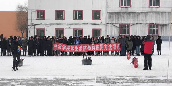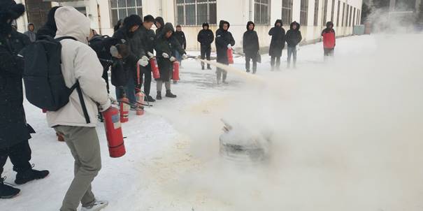 7点25分全体2019级学生和各年级学生代表在消防器材演练集合,保卫处防火科科长徐长明对学生进行消防安全教育,讲解并现场演示灭火器的正确使用方法。随后,学生代表每人领取一个灭火器进行实际灭火操作,将点燃的干柴扑灭,演习结束。